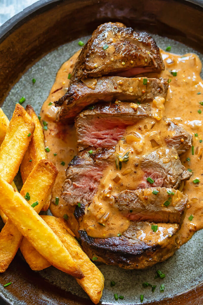 I’m not all that fancy. I’m a steak and chips girl to the core! And this steak recipe goes best with thick cut chips. I’m 100% a fries fan too, but those spindly sticks have no place on the plate here- they’ll be overshadowed by the sumptuous sauce and made soggy by the juicy slab of beef.